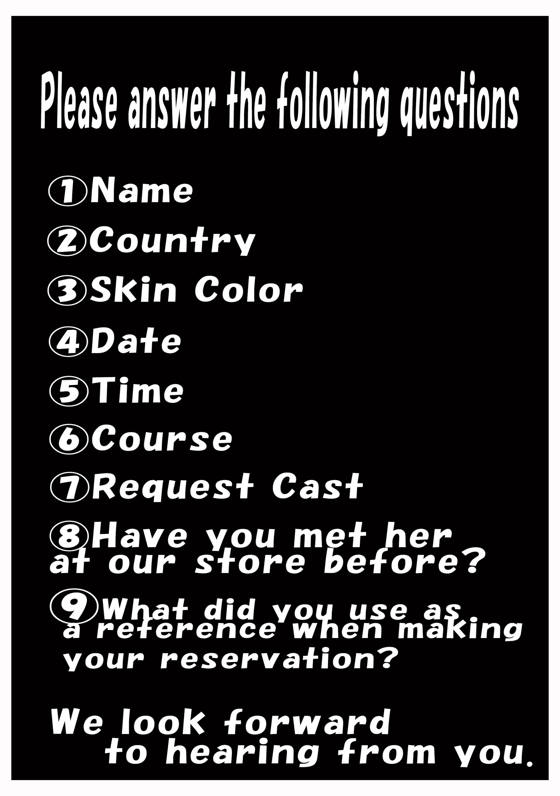 ① Please send us an email including the desired reservation date and time, and the name of the girl you wish to request.